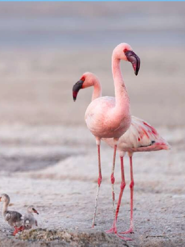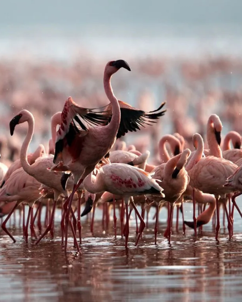 Lake Natron shelters many types of beautiful birds, big and small flamingos among them. Sometimes, there are tens of thousands. It’s a fantastic sight to watch the bright pink flamingos flying. They like Lake Natron because the water’s high alkaline level keeps predators away. From September to April of every year, most of the world’s Lesser Flamingos are born here. They lay their eggs in the mud, and the chicks hatch near the shore. You can see tiny gray chicks making their first steps if you use binoculars. Soon, their feathers will become pink. Other birds living around Lake Natron include pelicans. In the wild, they are very active and fun to watch.